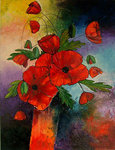 2007Klaprozen in vaas. Olieverf op doek met bladgoud ingewerkt. 60 x 80 cm.